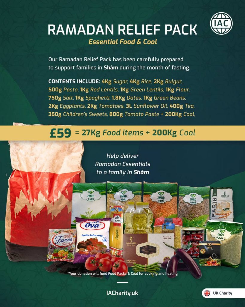 International Aid Charity are on the ground in Sham, working to distribute Ramadan Food Packs families in desperate need this Winter. Each £59 pack buys a 27 Kg Food Box and 200 Kg of Coal, feeding and heating an average size refugee family for a whole month.